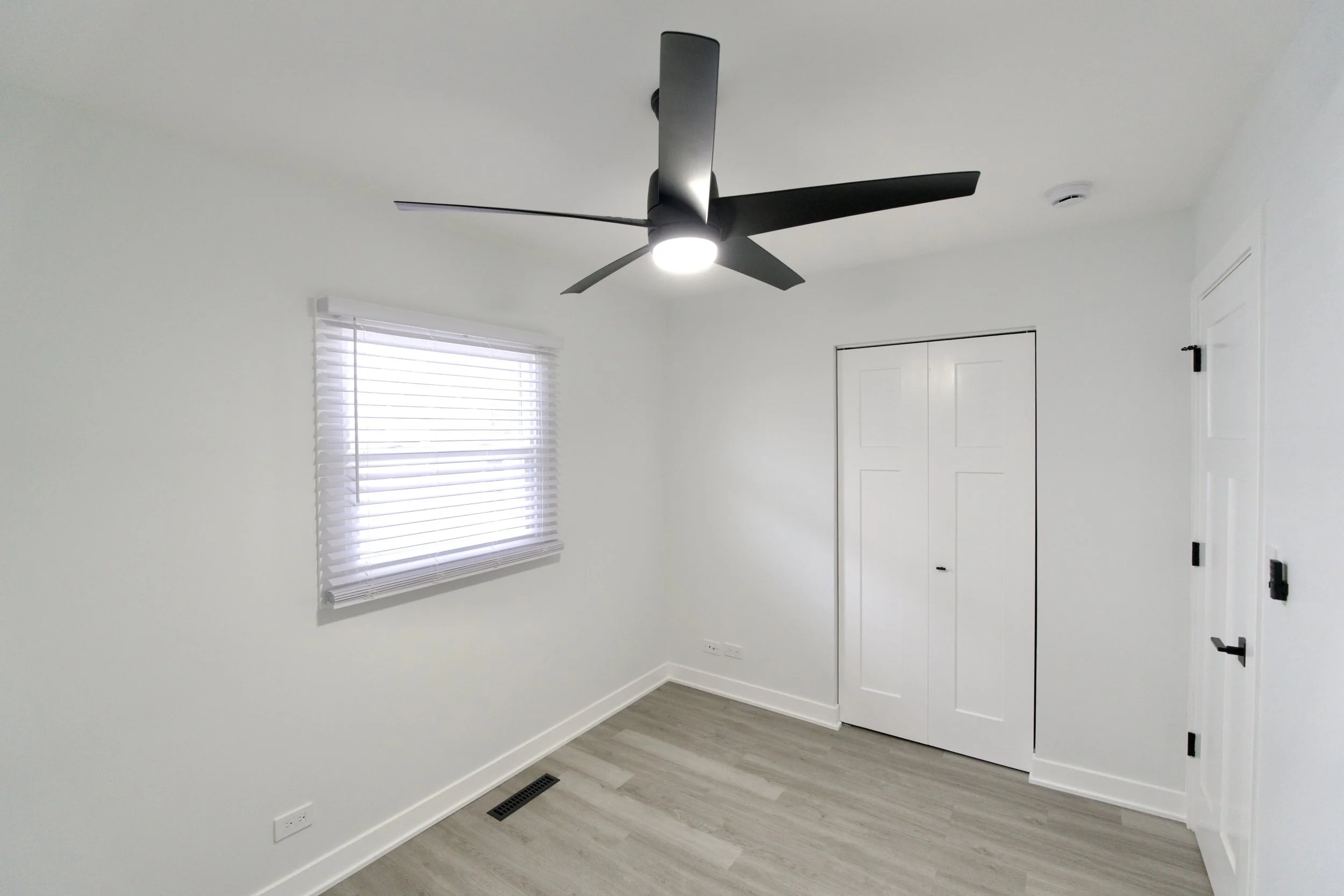 The home includes three beautifully designed bedrooms, each thoughtfully upgraded to offer both comfort and convenience. The primary bedroom stands out with custom-built modular shelving, providing flexibility to personalize your space exactly to your needs. Each bedroom features new windows fitted with blinds, flooding the rooms with natural light while ensuring privacy. Ceiling fans in every room enhance comfort year-round, while integrated Ethernet and coaxial wall jacks provide seamless connectivity, ideal for work-from-home setups or entertainment systems. These details come together to create bedrooms that are as functional as they are stylish and inviting.
