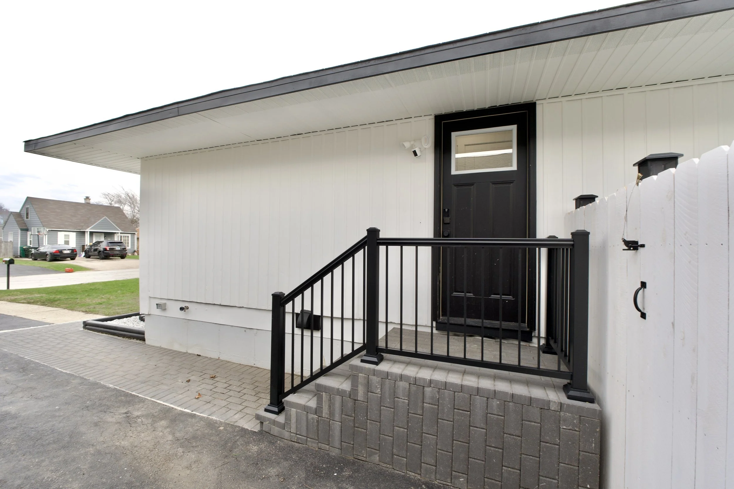 A brand-new white fence frames the property beautifully, accented by newly landscaped flower beds at the front, adding vibrant curb appeal. The spacious backyard boasts newly laid grass, offering ample space for outdoor activities and entertainment. Updated steps at both the front and side entrances feature contemporary pavers paired with sleek black railings, seamlessly blending function and design.